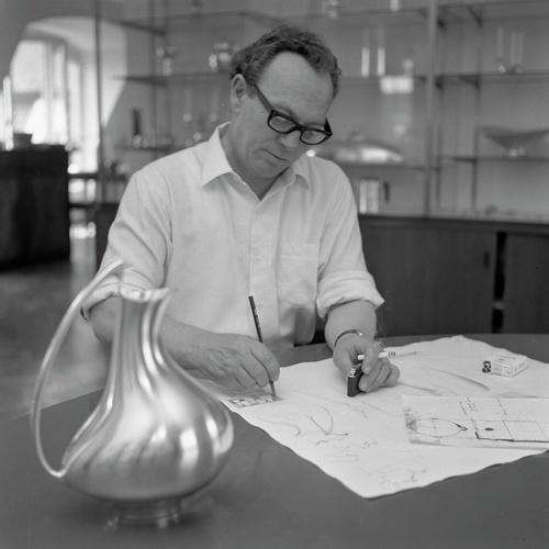 Henning Koppel (1918-1981) was an artist and designer whose work is lauded as emblematic of modern Danish design. Trained in drawing, watercolour, and sculpture, Koppel began working in jewellery and flatware with Georg Jensen at age 27. His skills as a draftsman allowed him to produce striking renderings of his designs, creating a fascinating body of standalone two-dimensionial work. Koppel balanced the rigid principles of functionalism against his own occupation with organic forms and curvilinear shapes. The result of this tension was the creation of some of the 20th Century’s most enduring designs – from clocks and watches to sensuous tableware.