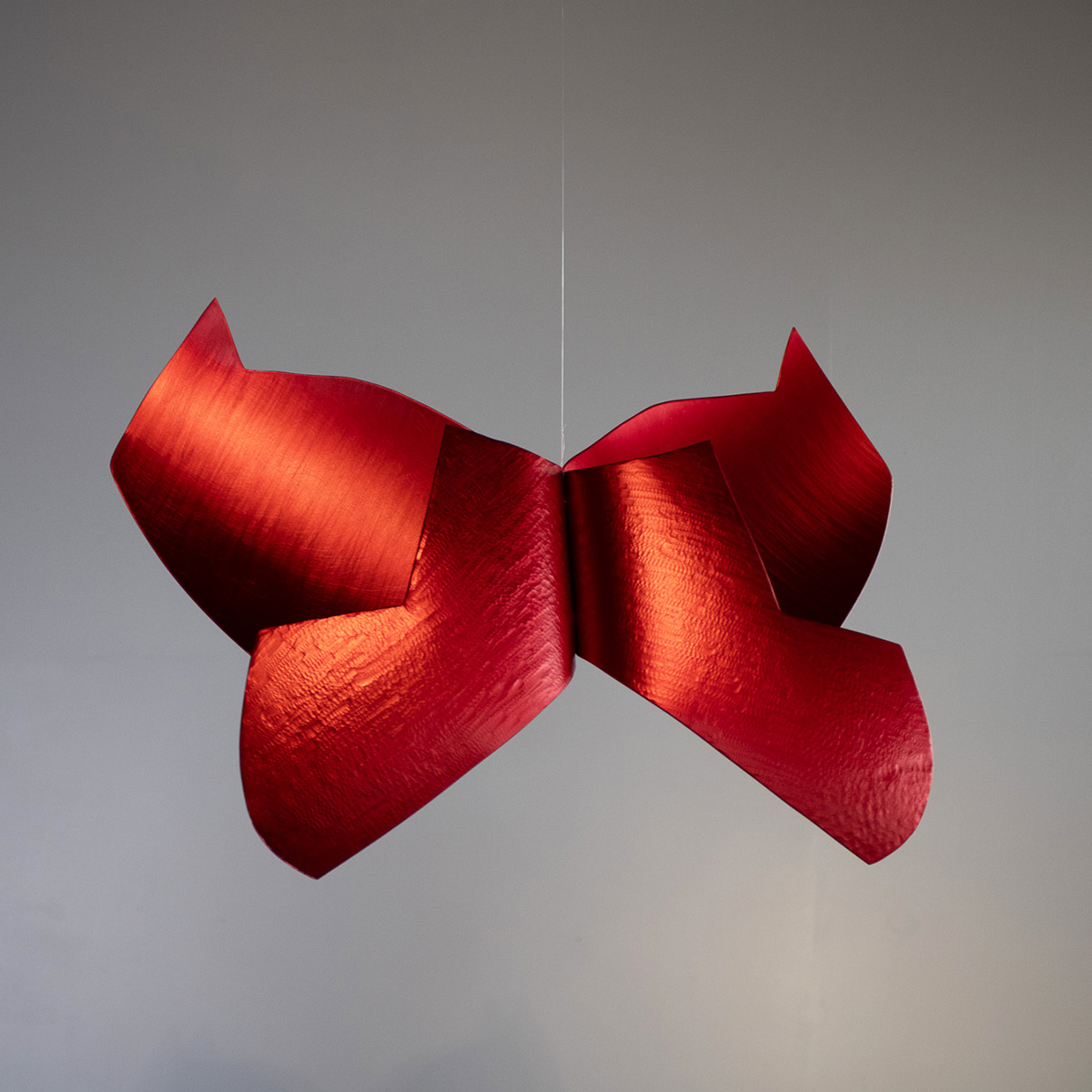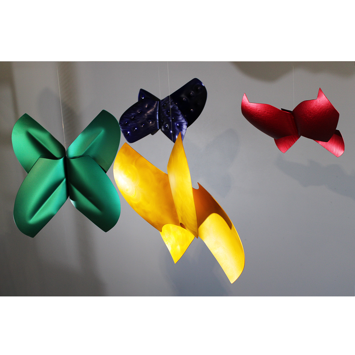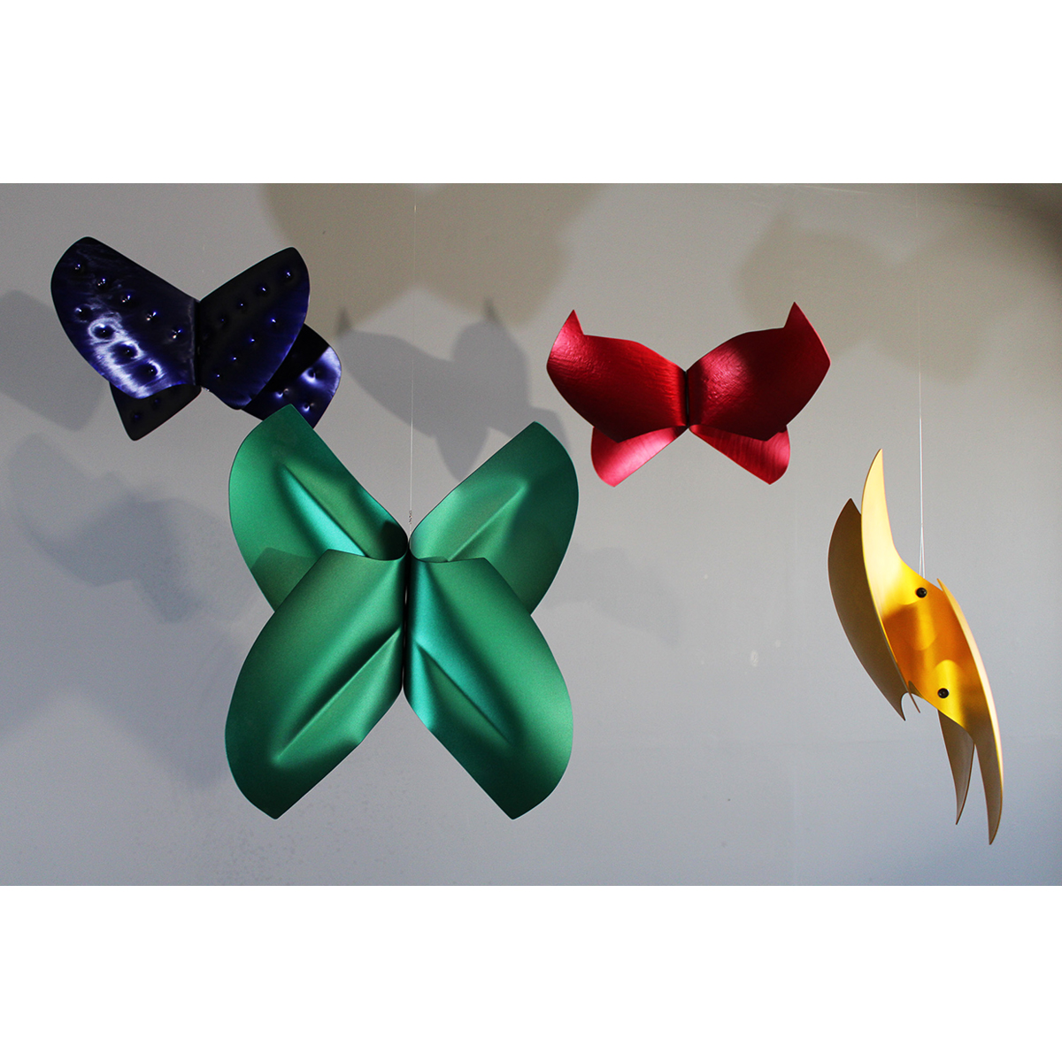 When hung, the butterflies spin, catching light on their surface. The play of light, shadow and motion provides continual intrigue, giving the mobiles the illusion of dancing on the air.