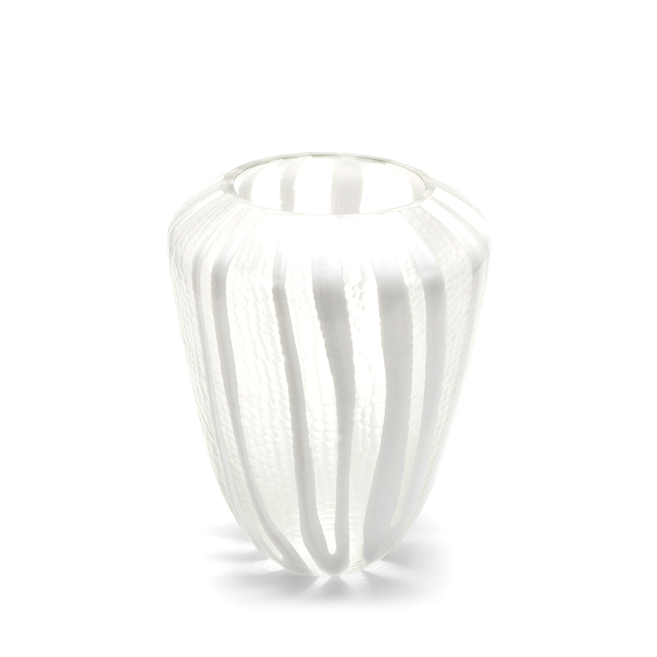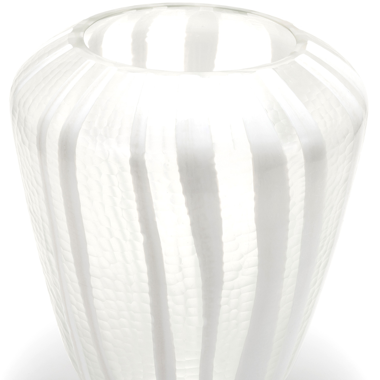 This vase’s effect is achieved through a process of encasing the ‘gather’ in clear glass before blowing it into the desired shape, which allows the intricate design to expand.