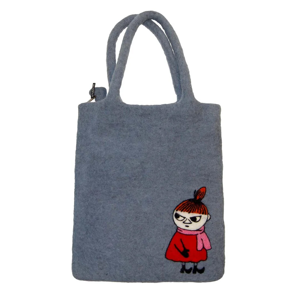A hand-felted woollen tote bag, adorned with a typically mischievious-looking Little My, from the world of Tove Jansson’s Moomin comic books.