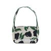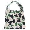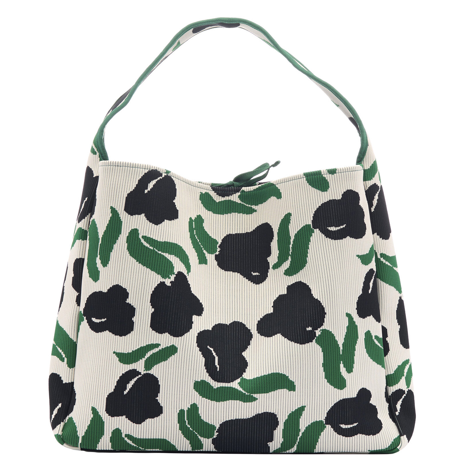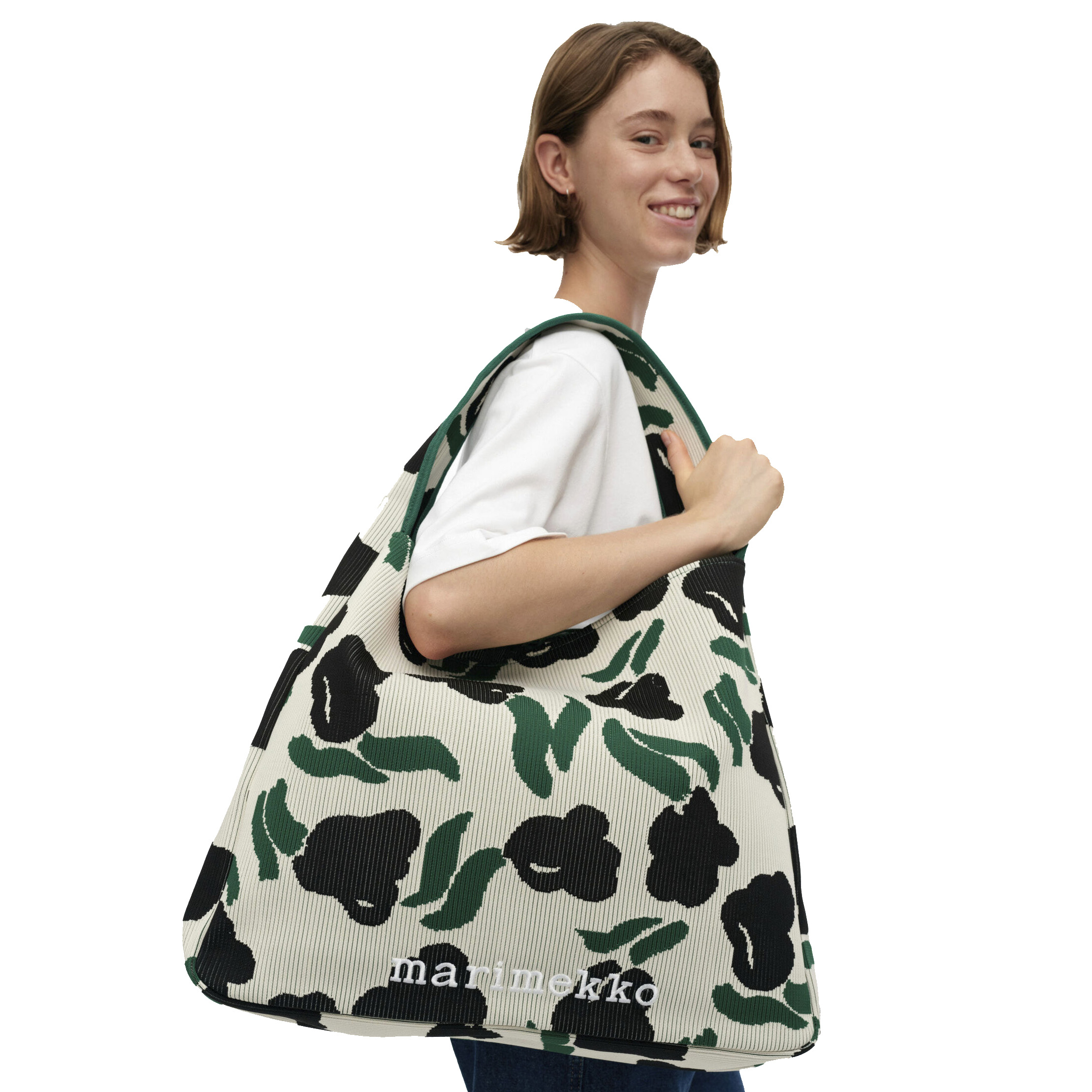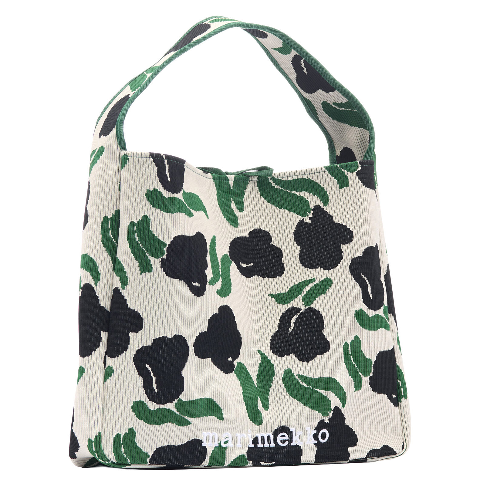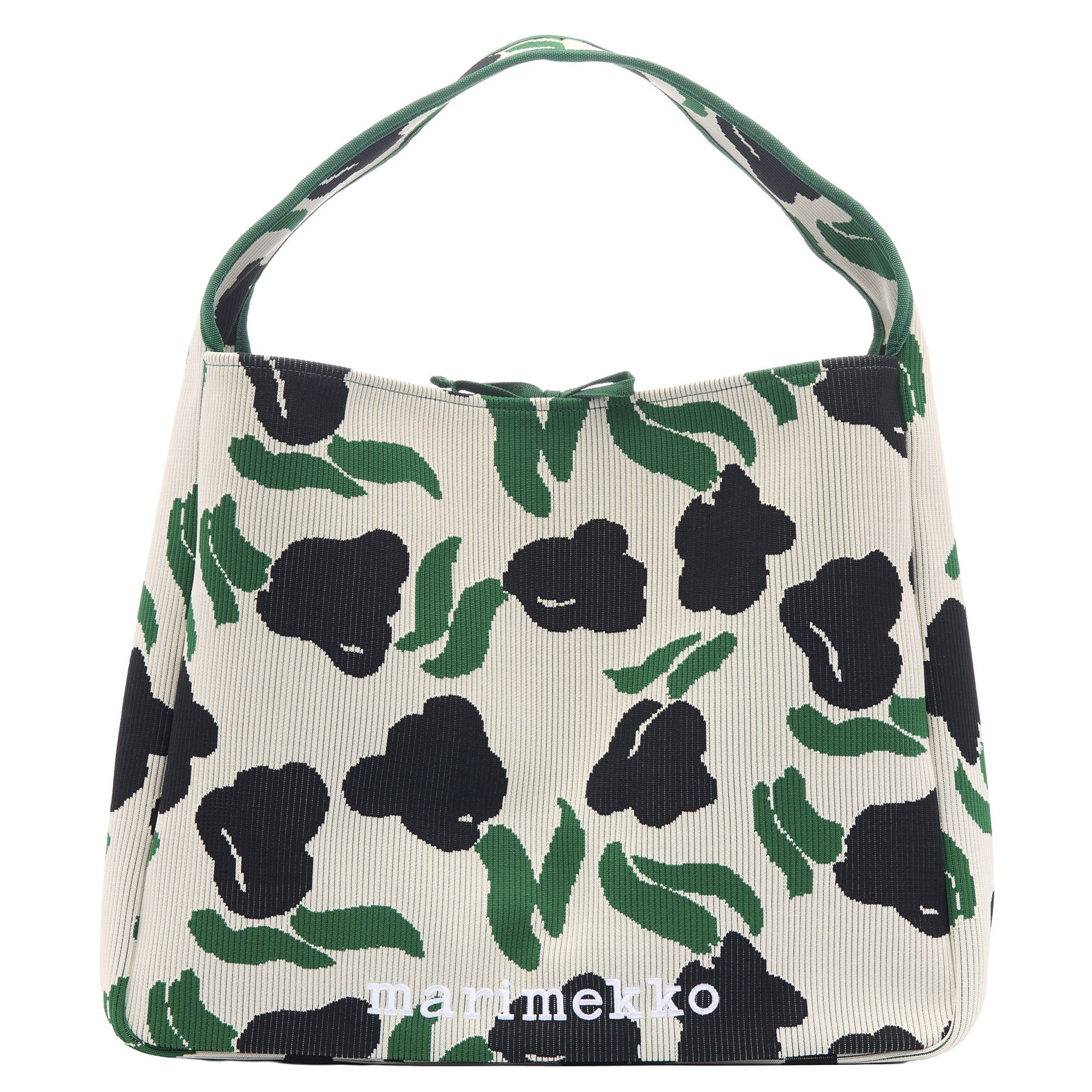 The bag features ribbed fabrication, a wide shoulder strap, a ribbon closure, and the embroidered Marimekko logo on the front.