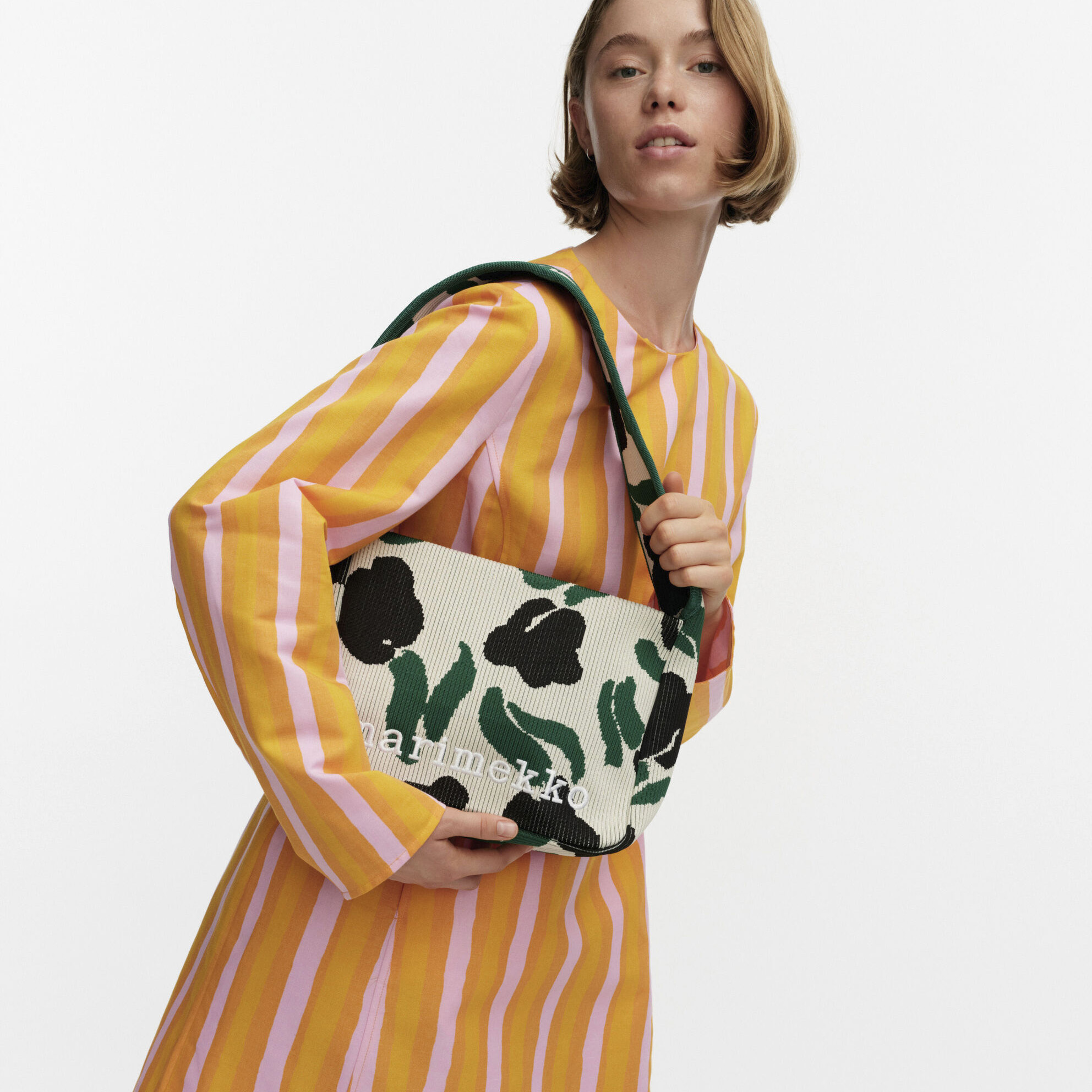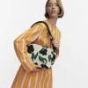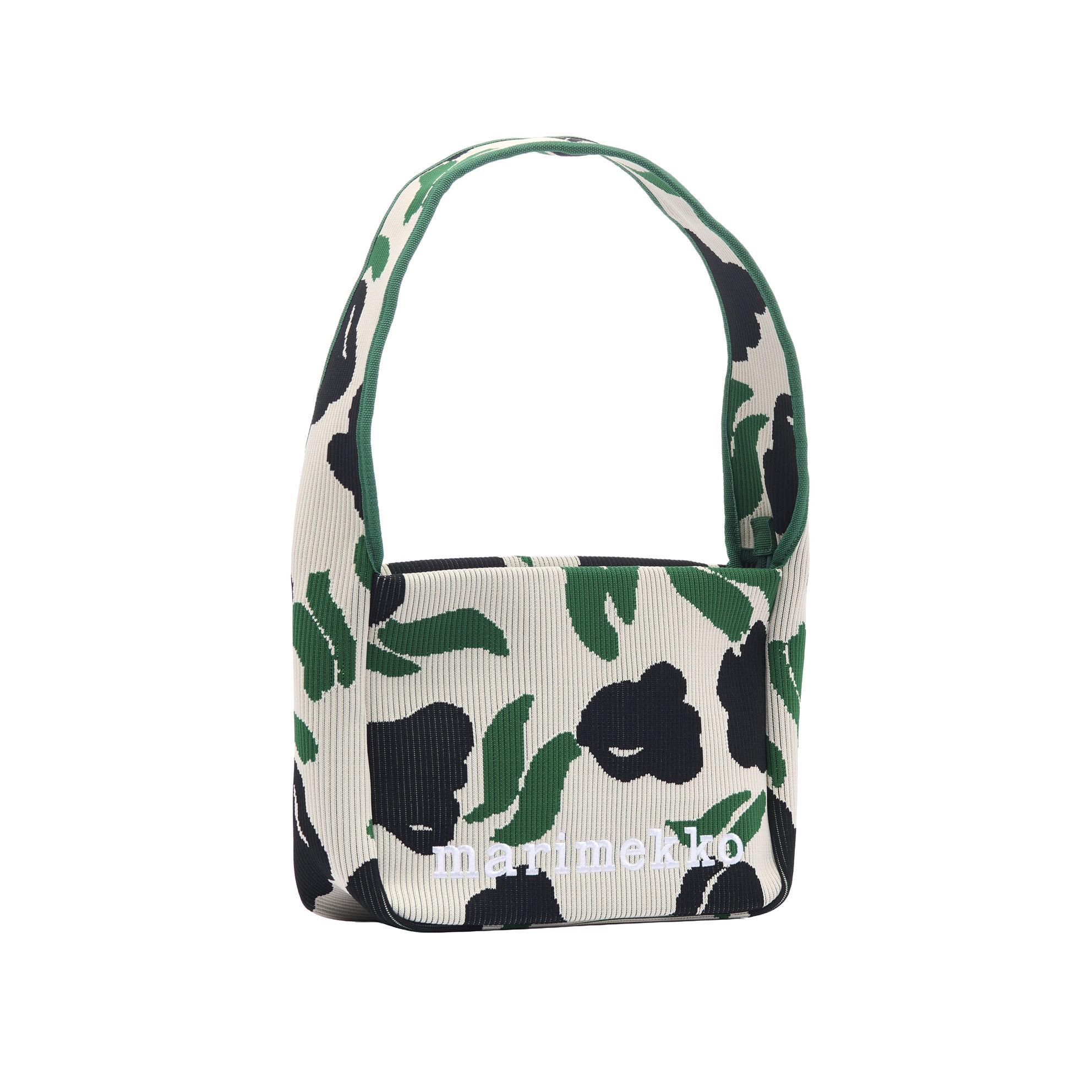 The bag features ribbed fabrication, a wide shoulder strap, a zipper closure, and the embroidered Marimekko logo on the front.