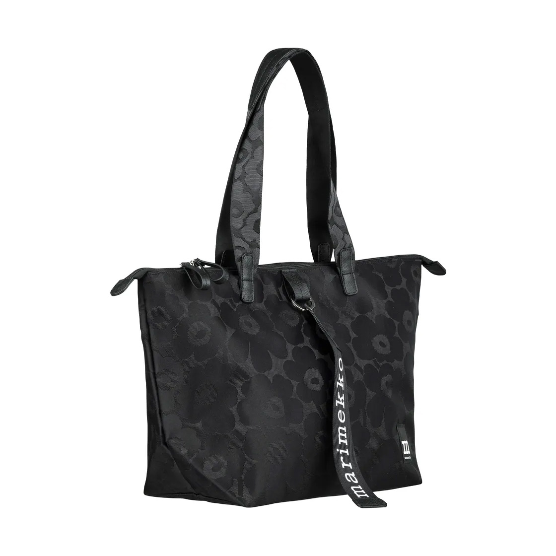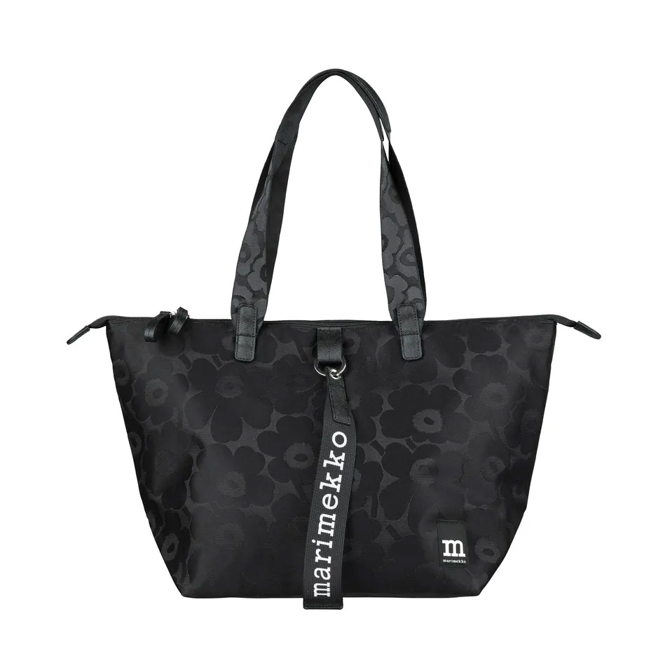 The inside is lined, and has one slip-in pocket. The front features the Marimekko logo label and the Marimekko keystrap – attached with a D-ring.