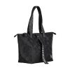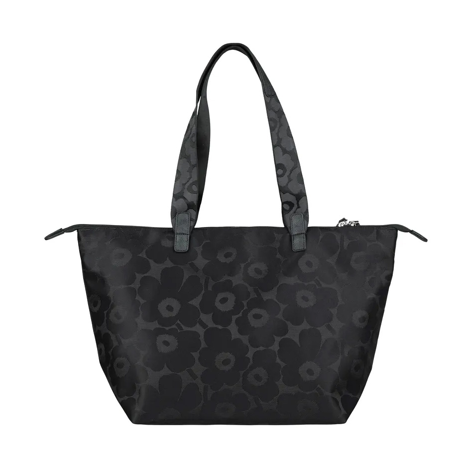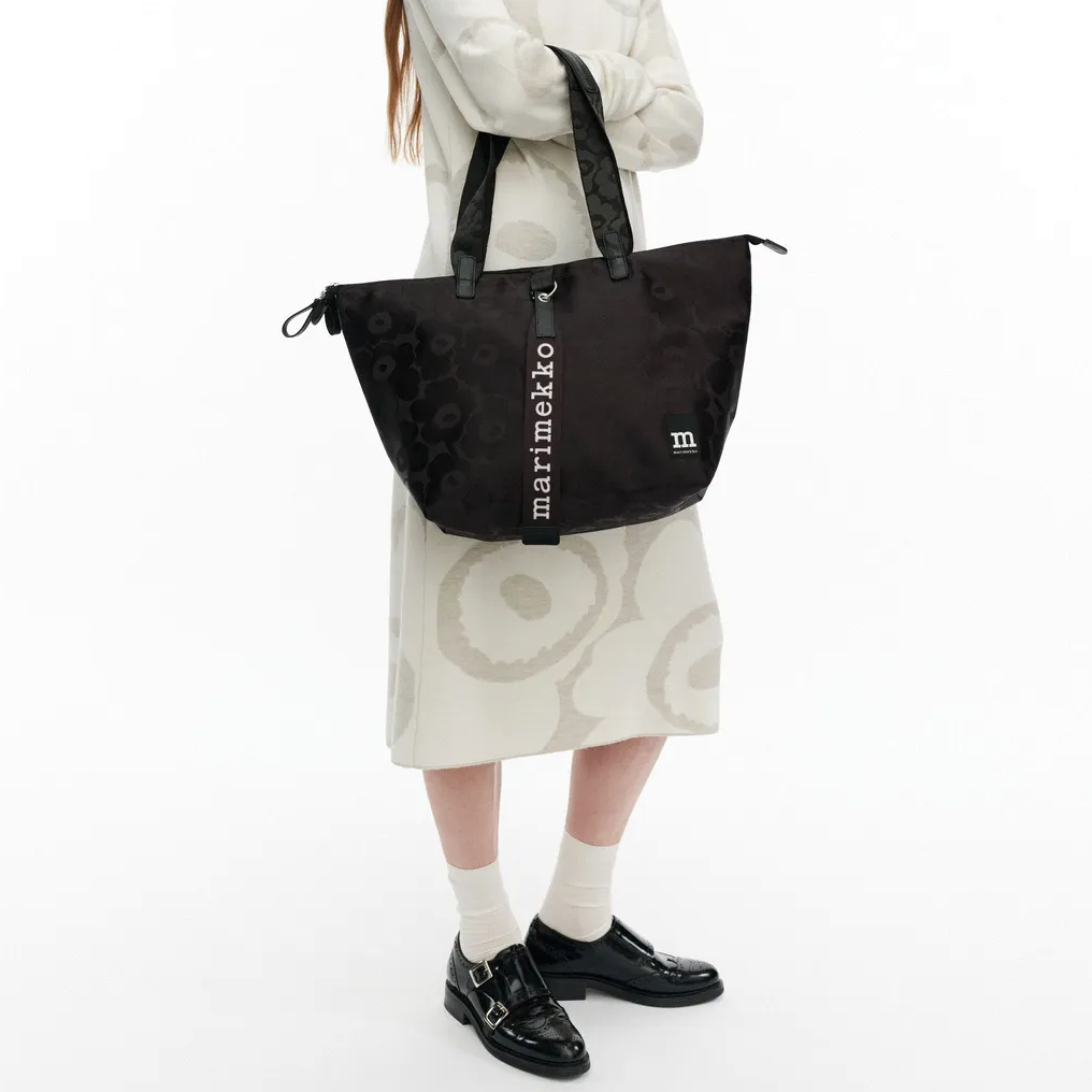 The Tote shoulder bag features the jacquard knit Unikko pattern. The bag has a recycled leather zippers, a handle, and an adjustable shoulder strap.
