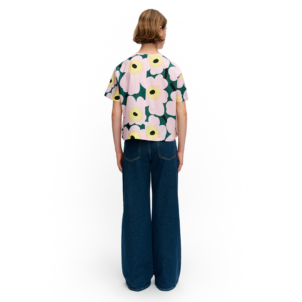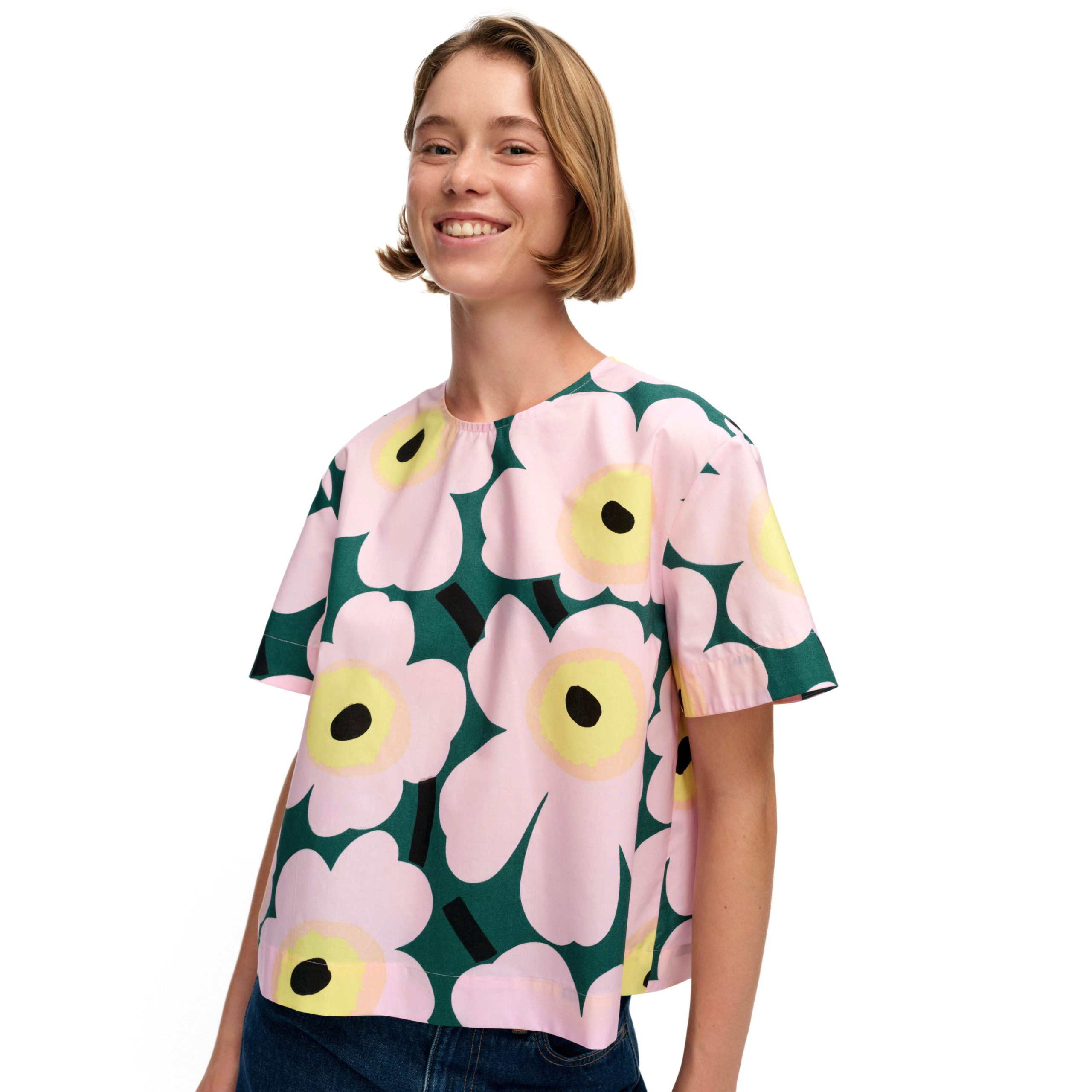 The short-sleeve blouse has a relaxed, A-line fit and features Maija Isola’s 1964 Unikko pattern. It has a round neck with a concealed zipper in the back seam for ease of wear.