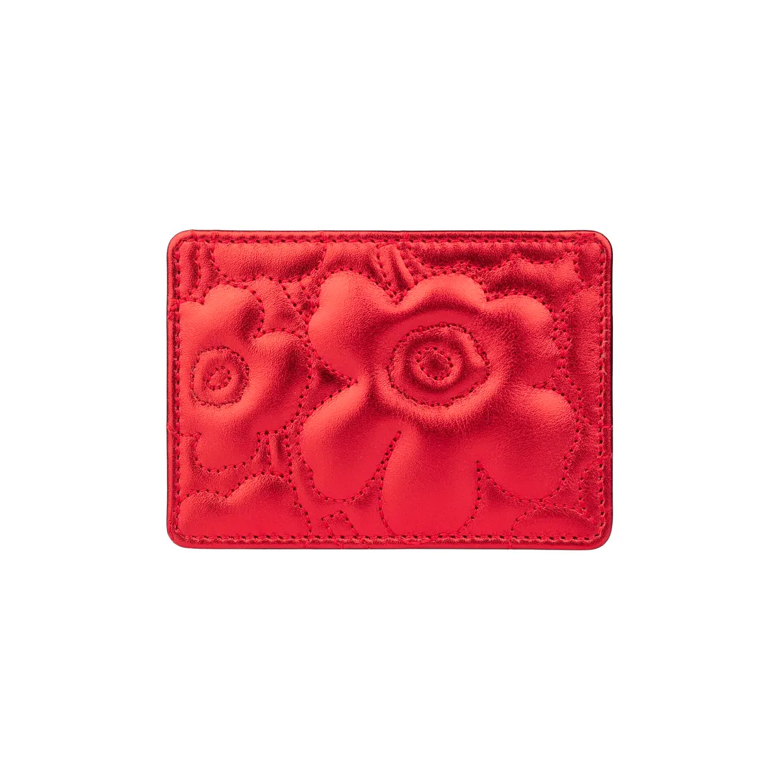A small leather cardholder with a metallic foil. The front of the cardholder is padded and features the topstitched Unikko pattern.