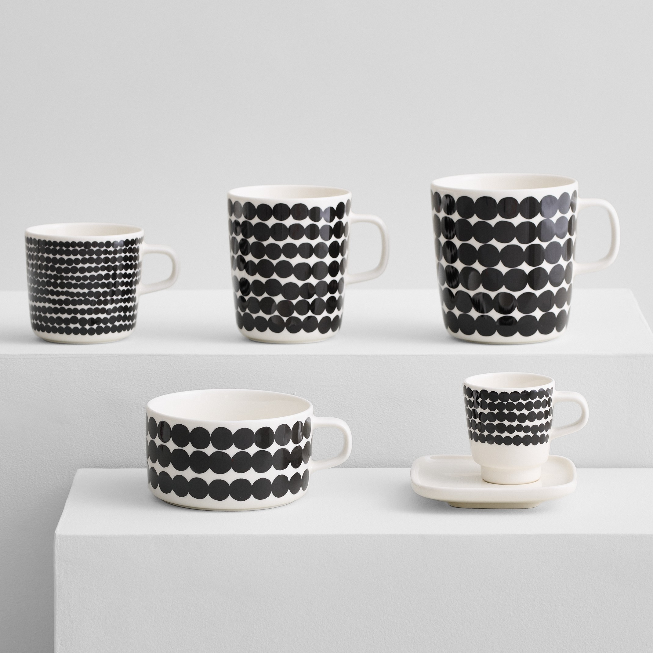 A small coffee cup designed by Sami Ruotsalainen featuring Maija Louekari’s Rasymatto (rag rug) pattern.
