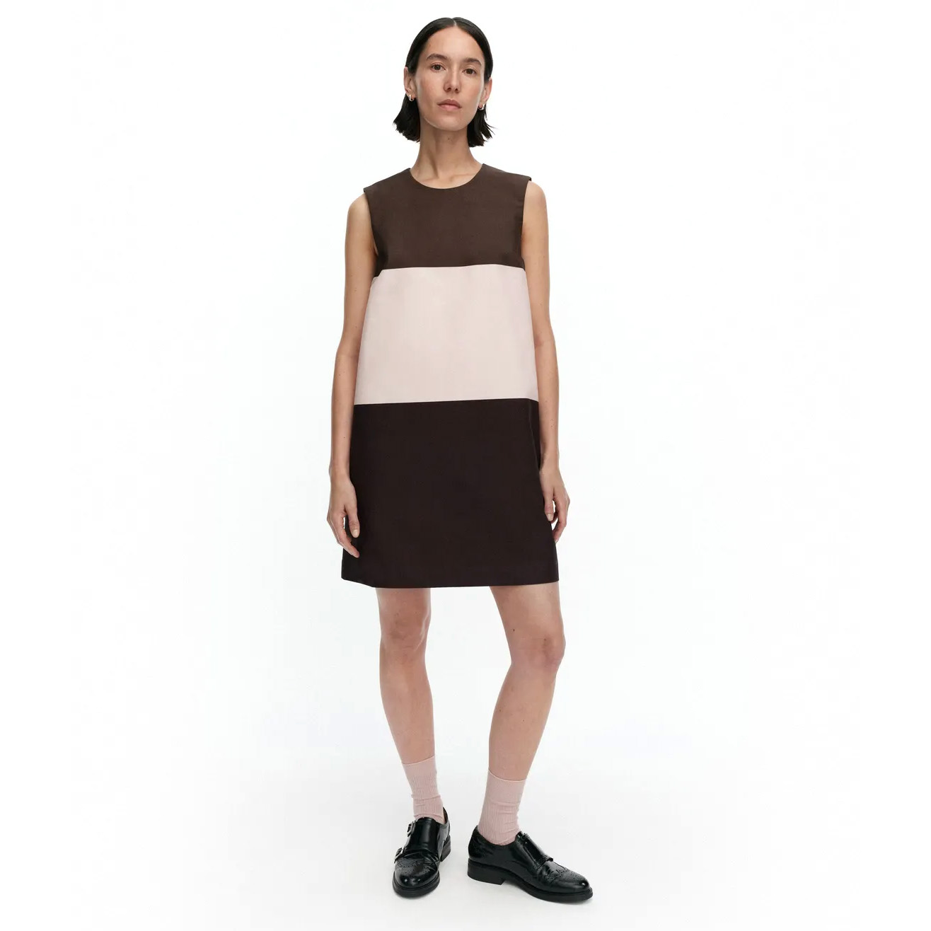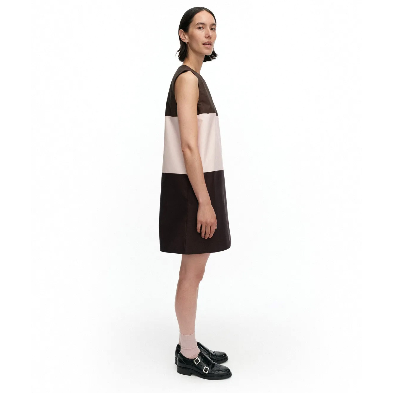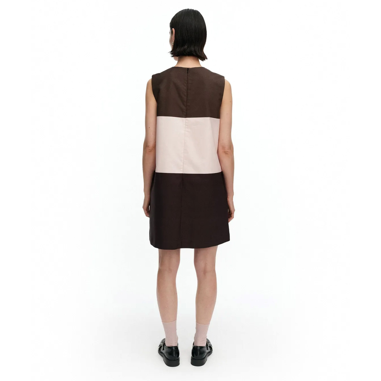 The Malli dress has a slim, A-line fit and features the Hennika pattern. The dress has a round neck, a concealed zipper in the central back seam, side seam pockets, and bust darts that give it a fitted silhouette.