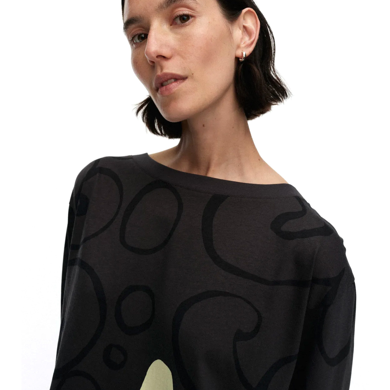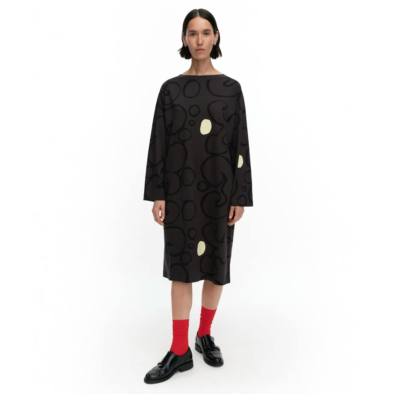 The Tavoittaa jersey dress has an oversized fit, straight silhouette, and features Annika Rimala’s Keidas pattern.