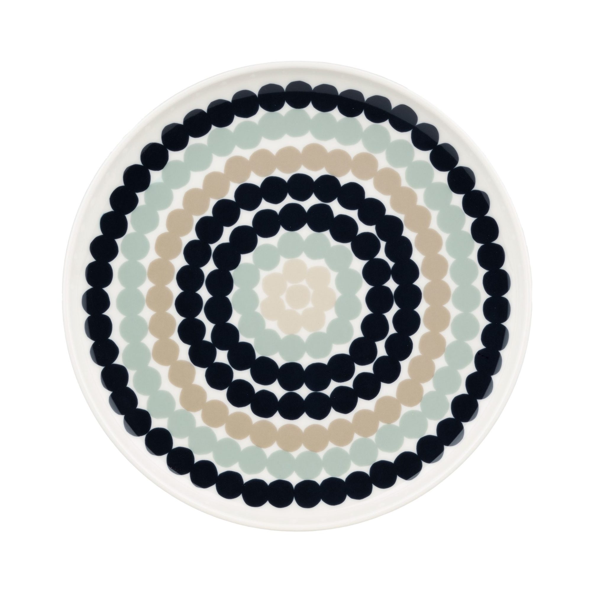 A round side plate designed by Sami Ruotsalainen featuring Maija Louekari’s Rasymatto (rag rug) pattern.