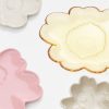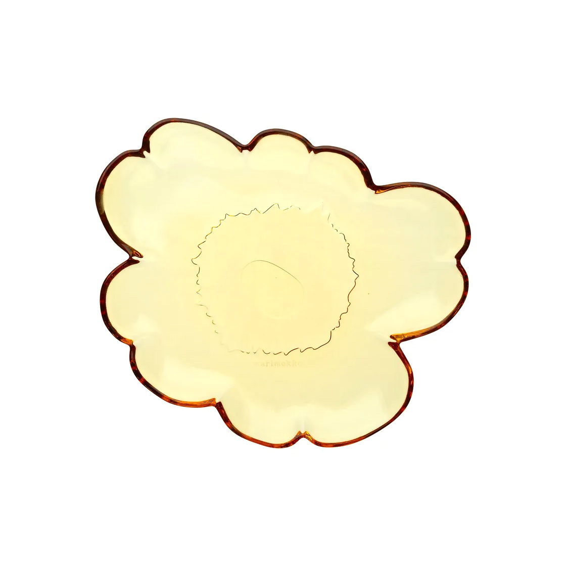 A Unikko flower-shaped plate, in a warm shade of translucent amber glass.
