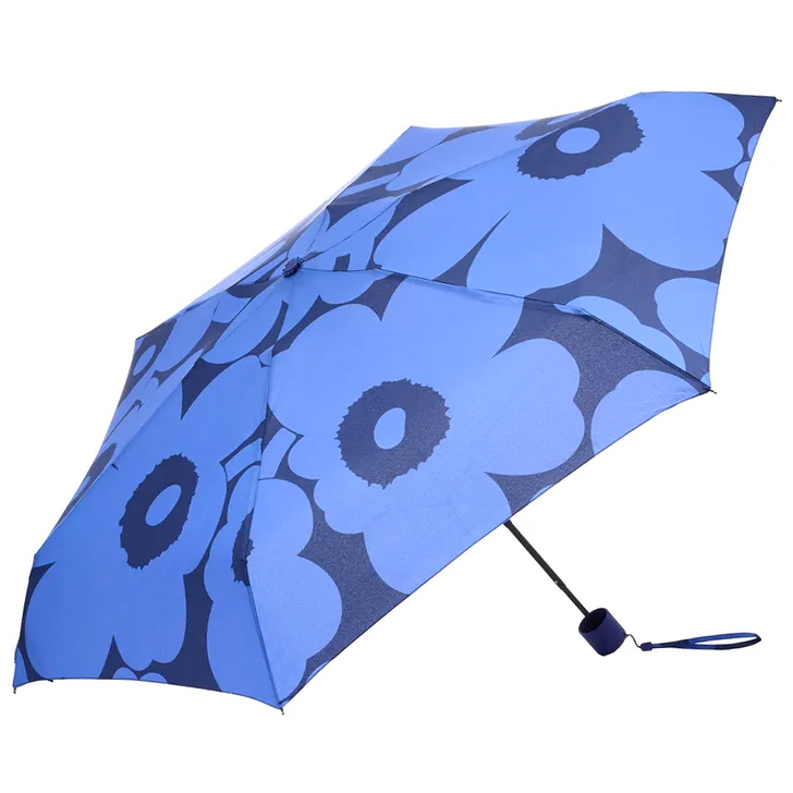 An ultra-light umbrella that is small enough to fit in any purse. It has a manual opening mechanism and features Maija Isola’s Unikko (poppy) pattern.