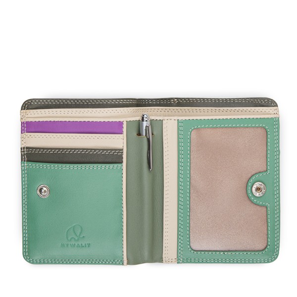 A compact wallet with 3 credit card slots, 2 note/receipt slots, a transparent ID card window, a zipped coin pocket and a pen.