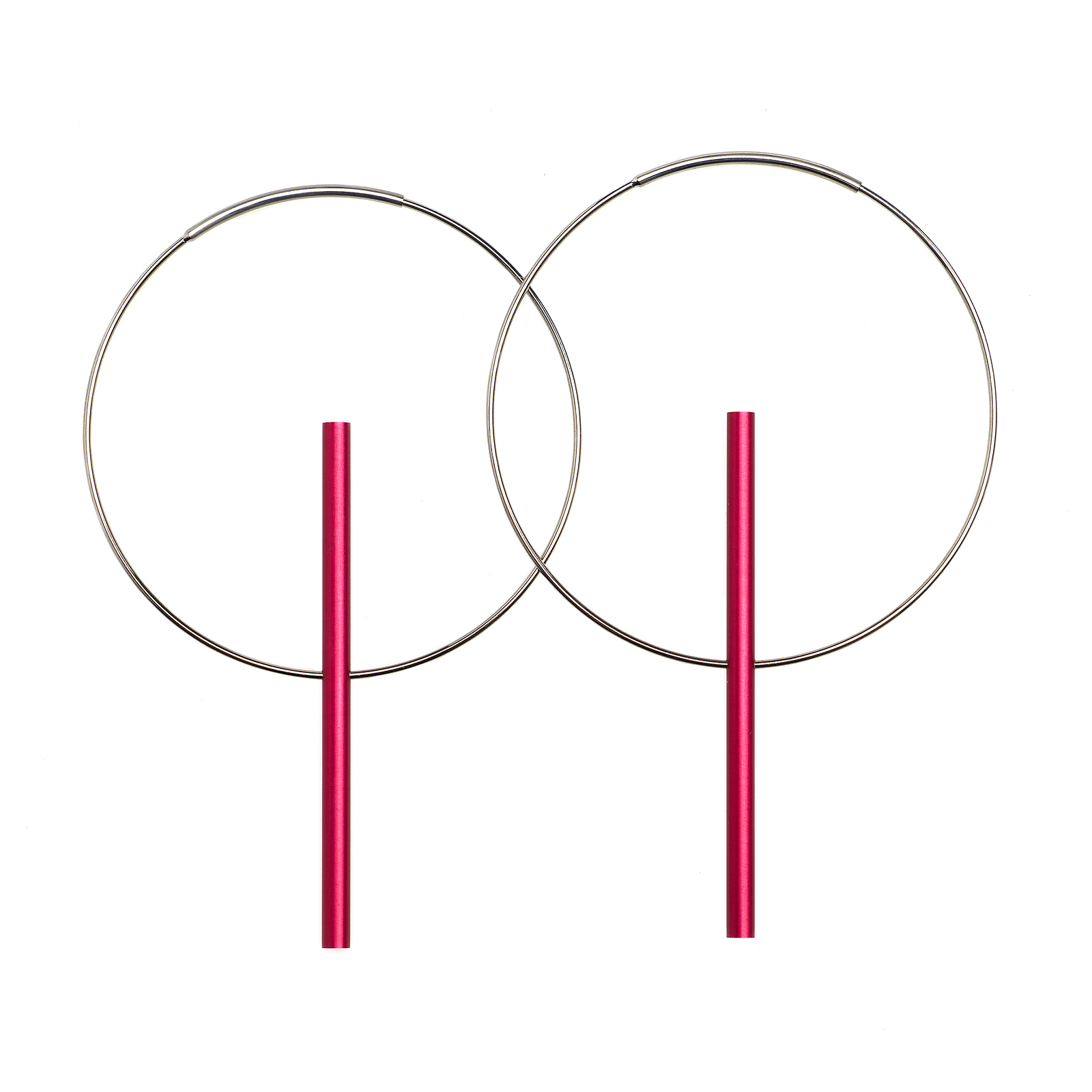 An anodised aluminium rod is suspended on a polished stainless steel hoop.