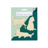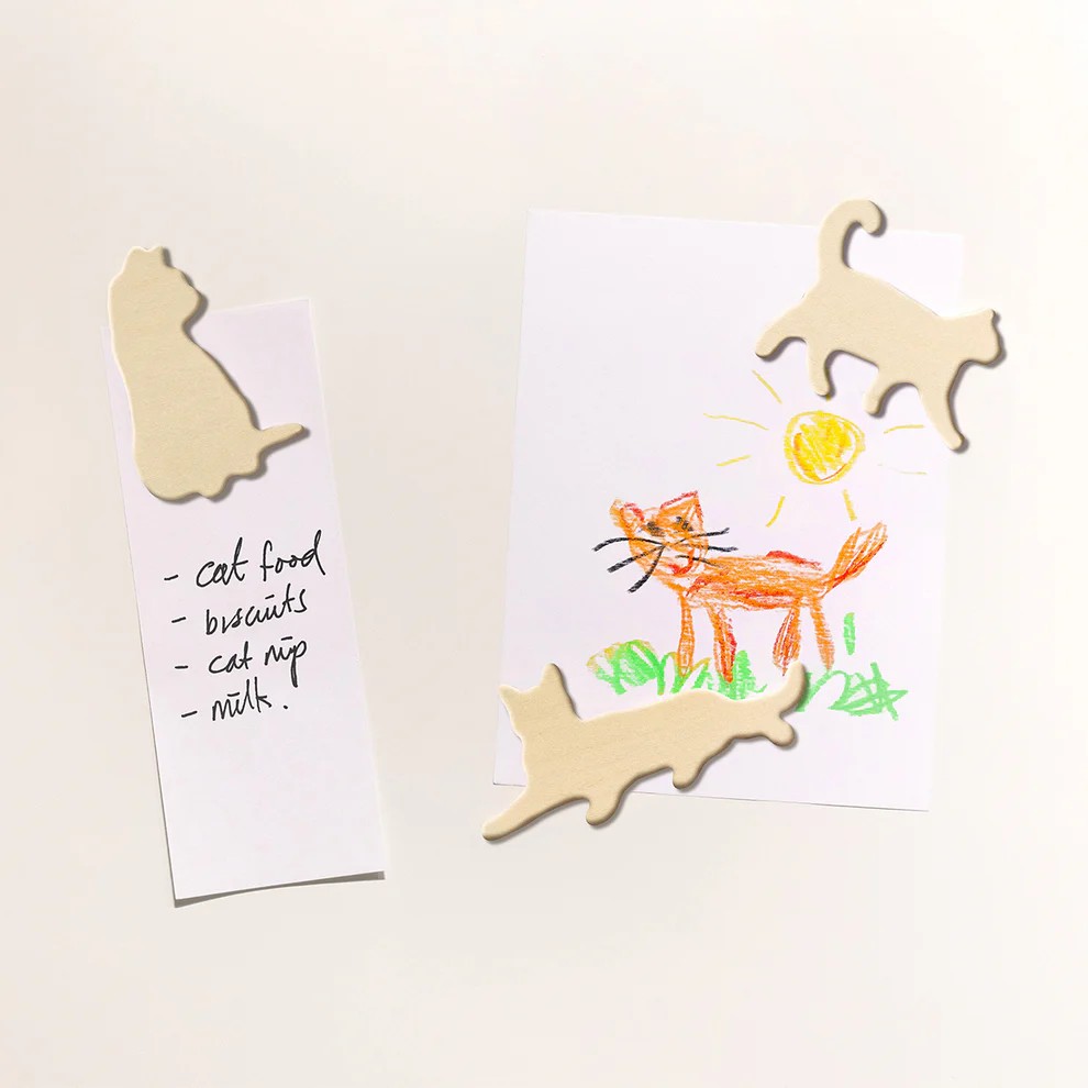 A set of 3 wooden fridge magnets in the shape of cat silhouettes.