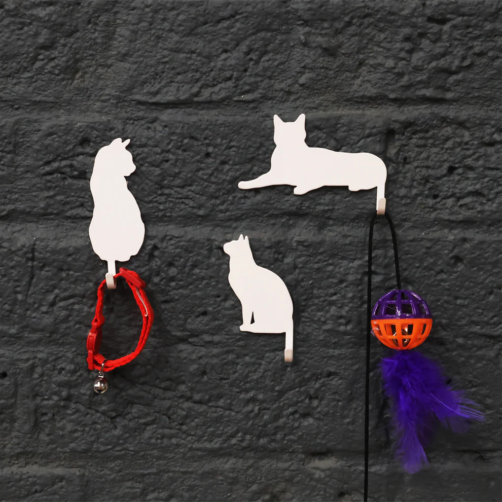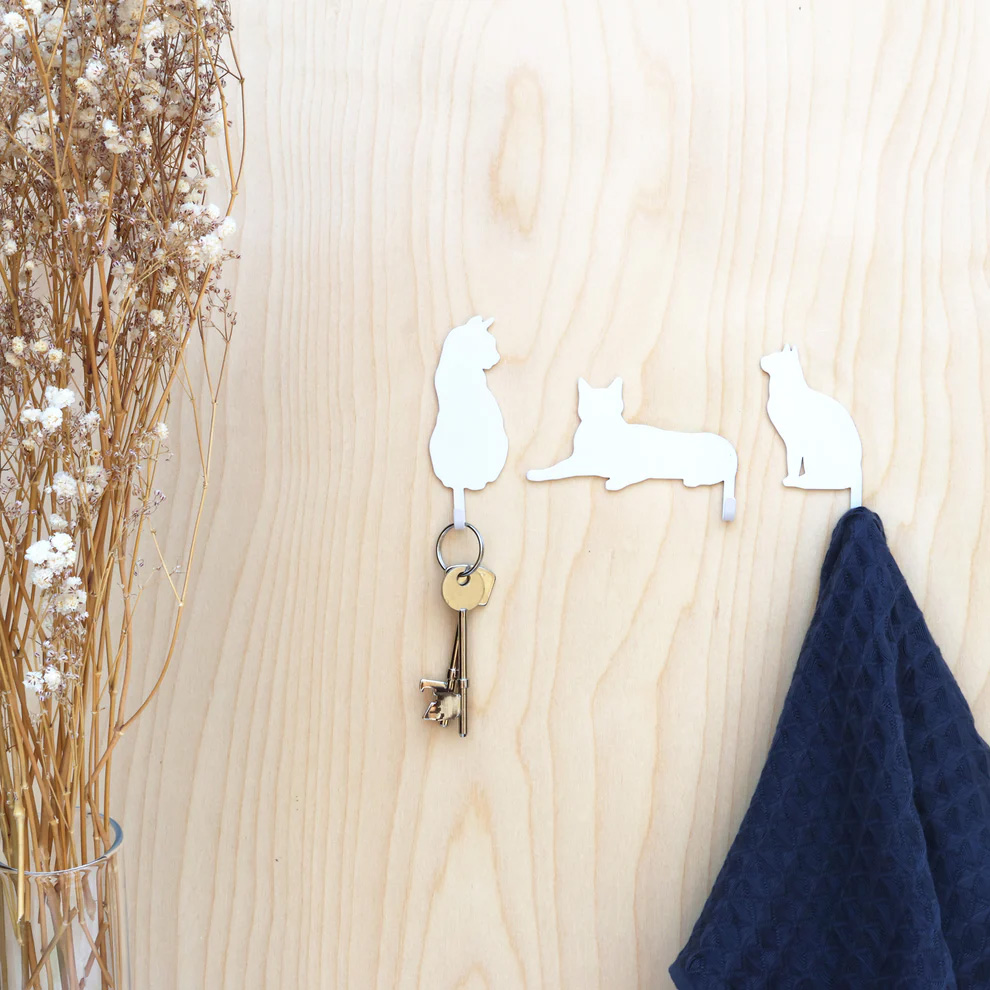 A set of 3 minimalist wall hooks in the shape of cat silhouettes.