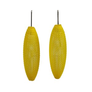 These handmade mesh earrings are made from heat-treated woven nylon and stainless steel. The contrasting mesh and steel create a durable, light and dramatic pair of earrings.